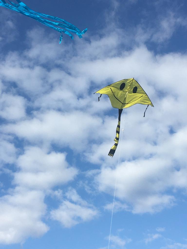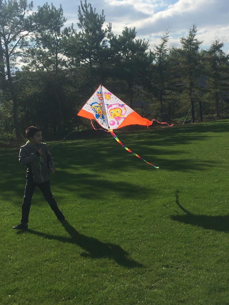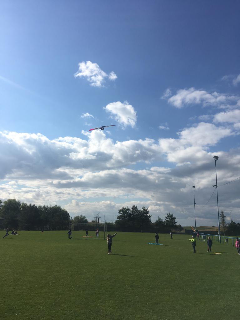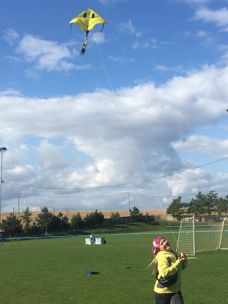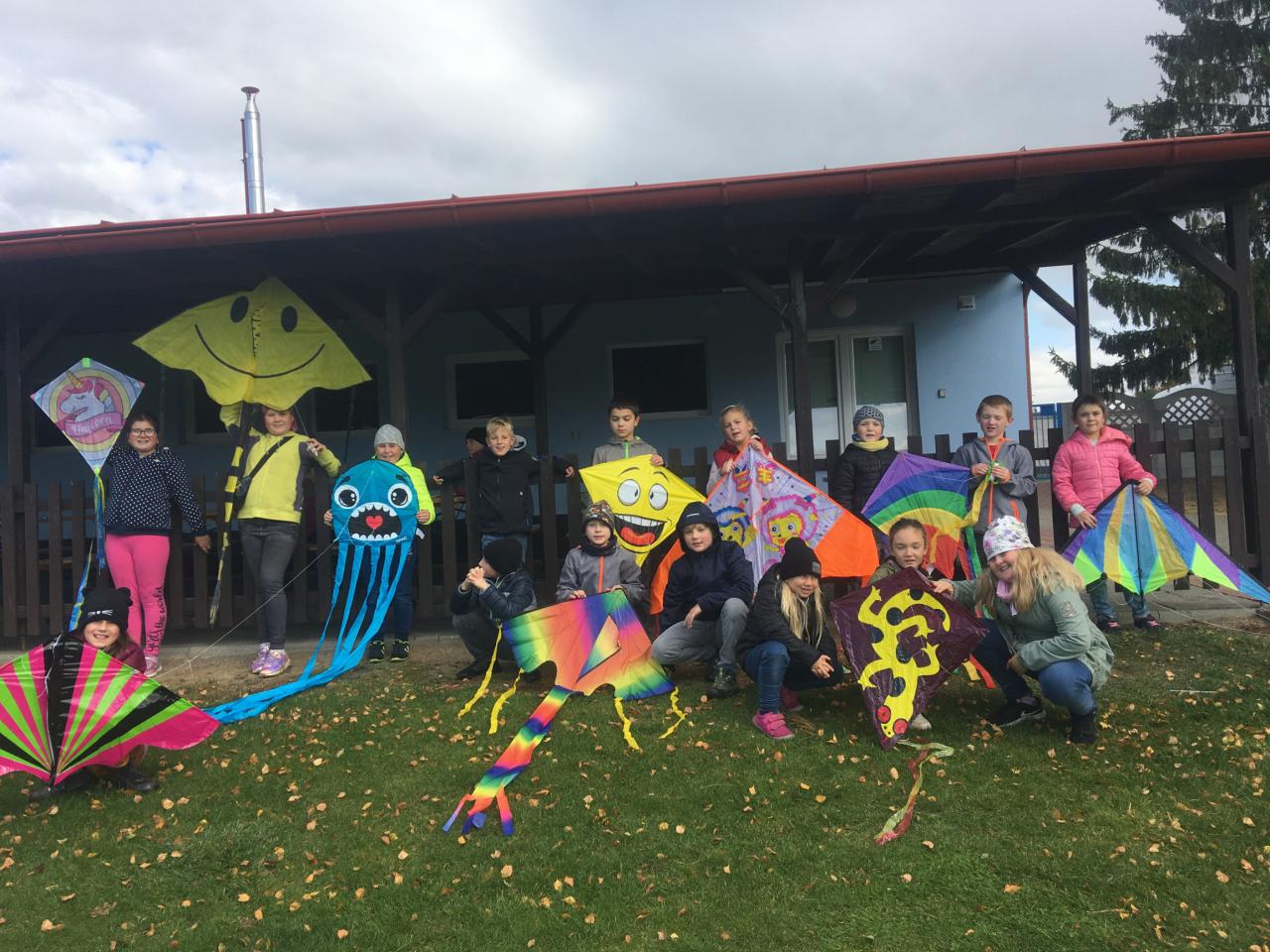 Pouštění papírových draků na hřišti pro všechny děti na škole